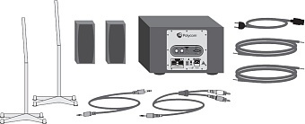 Акустическая система Polycom 2200-21969-240 состоит из двух колонок с возможностью установления на горизонтальную поверхность или на подставки (подставки входят в комплект) и одного сабвуфера, который устанавливается исключительно на горизонтальную поверхность. Сабвуфер акустической системы Polycom 2200-21969-240 воспроизводит звуковые колебания частотой от 5 до 200 Гц в то время, как колонки воспроизводят звук частотой от 200 до 20000Гц